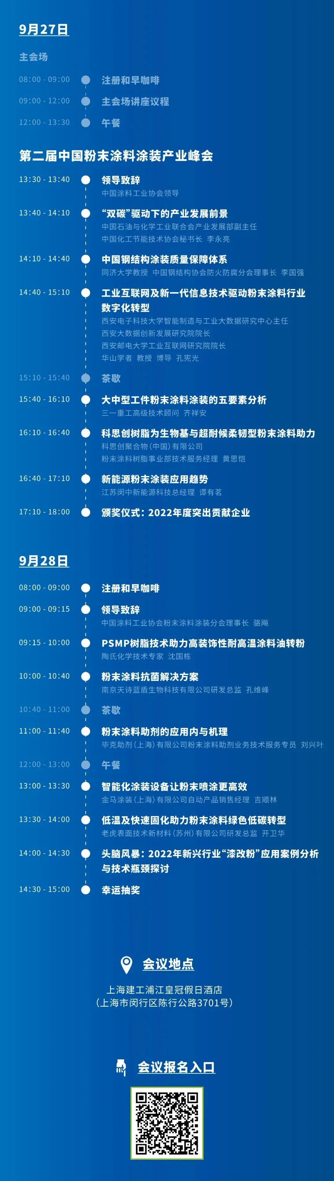 为了推动我国粉末涂料及涂装行业的发展,中国涂料工业协会粉末涂料涂装分会将于2022年9月27~28日在上海建工浦江皇冠假日酒店召开“第二届中国粉末涂料涂装产业峰会”。另外,CITC第九届绿色工业涂料创新技术应用大会将会同期举办。